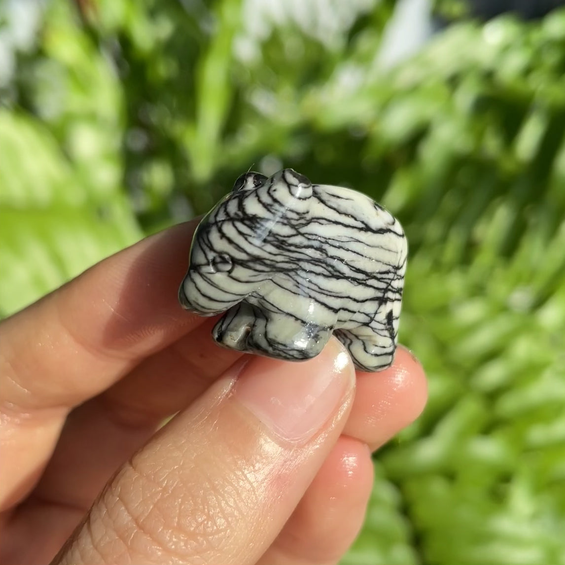 Function:Black Net Stone Bear Mini Carving features a striking deep black base with natural net-like patterns, skillfully carved into a small bear shape symbolizing strength, protection, and resilience. Known for its grounding and stabilizing energy, Black Net Stone is believed to enhance focus, courage, and personal power. Its compact size makes it perfect for display on a desk, shelf, or in a crystal collection.