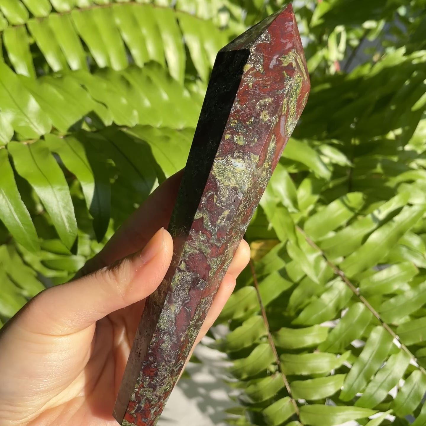 Function:The Dragon Blood Stone Sceptre is expertly carved from natural Dragon Blood Stone, featuring a striking mix of deep green and red patterns that seem to hold the power of earth and life. Its smooth, wand-shaped design is comfortable to hold while fully showcasing the stone’s natural beauty.